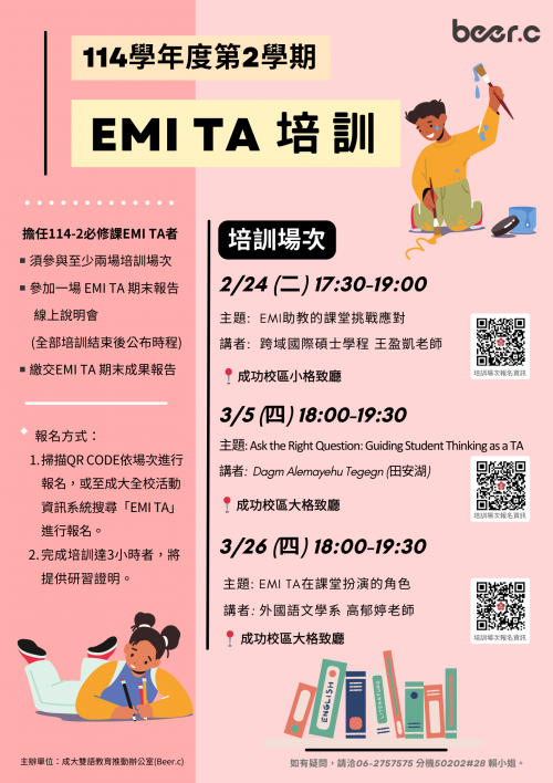 - 掃描海報 QR Code 或至「成大全校活動資訊系統」搜尋關鍵字 「EMI TA」 進行報名。