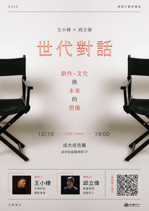 本場講座邀請影像創作領域的重要導演——王小棣與邱立偉,展開一場跨越世代的深度對談。兩位導演分別代表不同世代的創作視角,從影像、故事到文化內容的發展,分享他們對創作初衷、時代變遷與未來媒體樣貌的思考。王小棣導演以豐富的人文關懷與長期實踐,關注社會與青年的創作能量;邱立偉導演則以動畫與新媒體形式,探索文化內容的創新可能。透過這場「世代對話」,期許與成大師生一同思考,創作如何在快速變動的世界中持續發聲,並為台灣文化注入新的想像力與生命力。