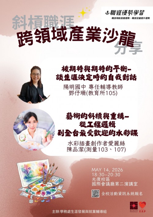 「被期待與期待的平衡-談生涯決定時的自我對話」;「藝術的斜槓與重構——從工程邏輯到全台最受歡迎的水彩課」 |