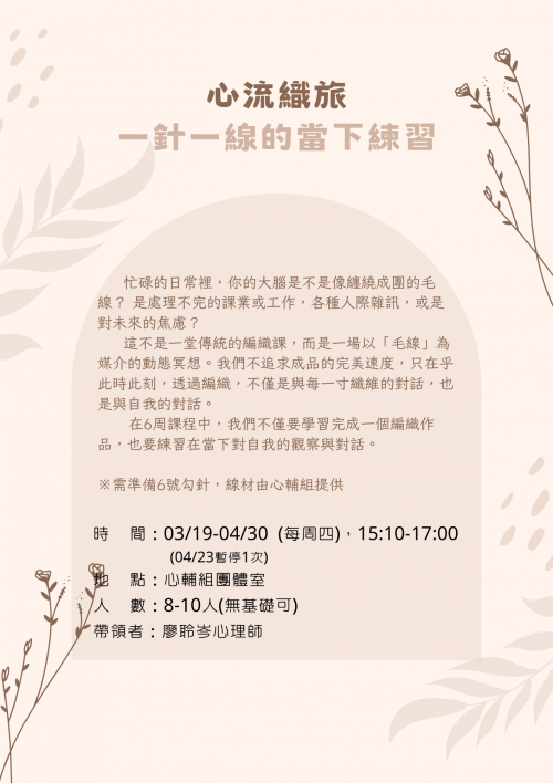 時 間:03/19-04/30 (每周四),15:10-17:00 (04/23暫停1次)