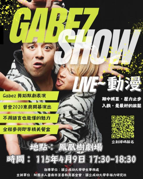 日本人氣肢體喜劇團體GABEZ,以默劇結合舞蹈與幽默節奏,打造無語言也能大笑的精彩演出,曾登上2020東京奧運開幕式,以「動態圖標」表演驚艷全球!本活動特別邀請GABEZ來到成功大學,帶來輕鬆又驚喜連連的全新演出,邀請大家一起開懷大笑!